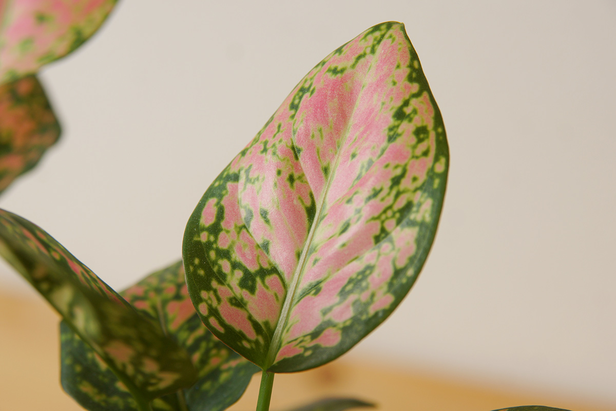 アグラオネマ・アンニャマニーといえば赤に近いピンク系の色合いの斑が特徴で、状態と管理が良いと、成熟した株の葉なら9割近くピンクの斑が占めるような葉の様子が楽しめ、去年も回復してからは全体でいうと半分ほどが、斑が占める葉もありましたが、今年の冬はいよいよ9割近い葉や、このような8割から7割ぐらいまで斑が占める葉が増えてくれました。