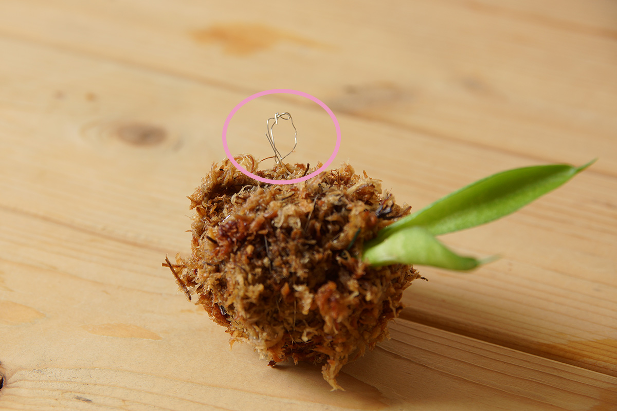 また他の苔玉でもやっているように、ピンクの円の部分のように引っ掛ける輪っかも作りました。