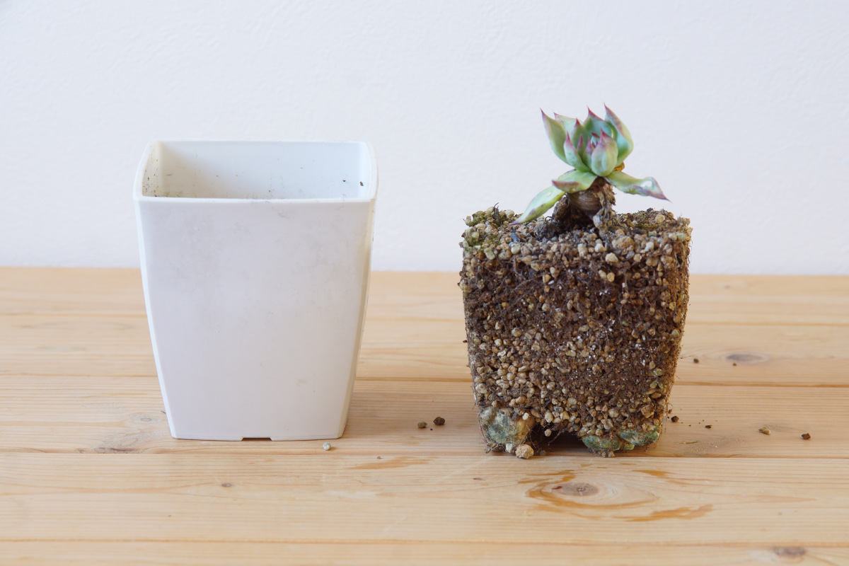 四角形の鉢なので根鉢が四角形と独特な様子ですが、ここでも気になる様子があります。