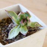 また葉先付近の色合いも違い、先にご紹介した3株は爪と呼ばれる先が尖った部分だけピンク系の色合いをしていますが、こちらの株は爪だけでなく先端付近のふちも含めてピンク系の色合いをしています。