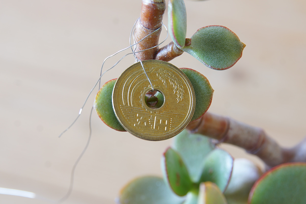 そこで昔から金運を招く験担ぎとして、あくまで縁起ものの遊びの一種ではありますが、金のなる木に5円玉を通して、金運を呼び込んでくれればと思いますので、その為の仕込みをしたいと思います。