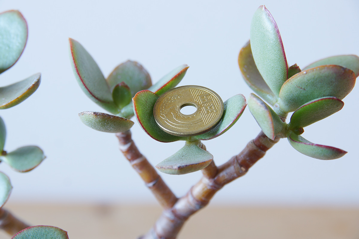 その5円を新芽に通し、このようなイメージに仕立てた姿から、いかにもお金が生ったといった見た目から、金のなる木と呼ばれているという説もあります。