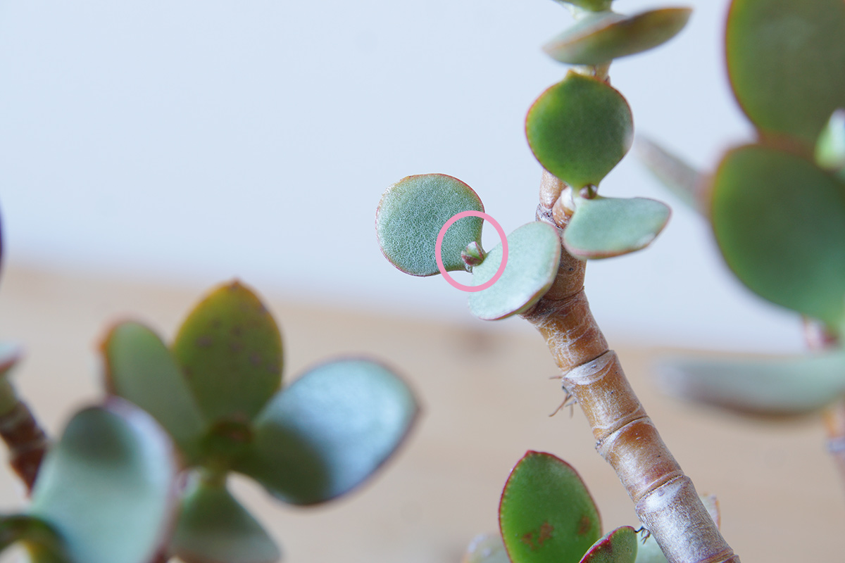 そこで金のなる木の新芽を確認すると、ところどころの先端付近にこのような新芽がありますが、葉の向きや形状次第では、このように5円玉が浮いてしまい、紐などで固定したとしても5円玉の穴を通る頃には、このような新芽はもっと大きく生長することが想像できますので、現実的に不可能です。