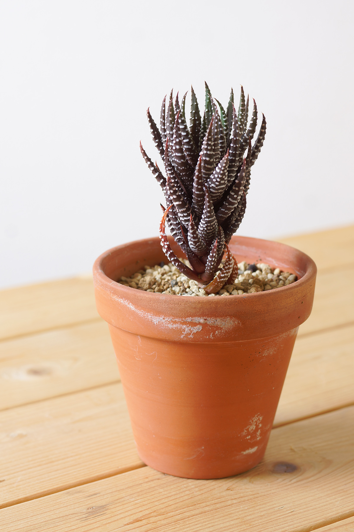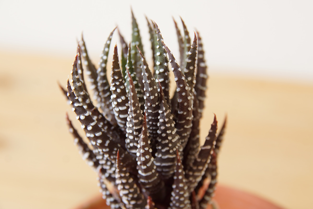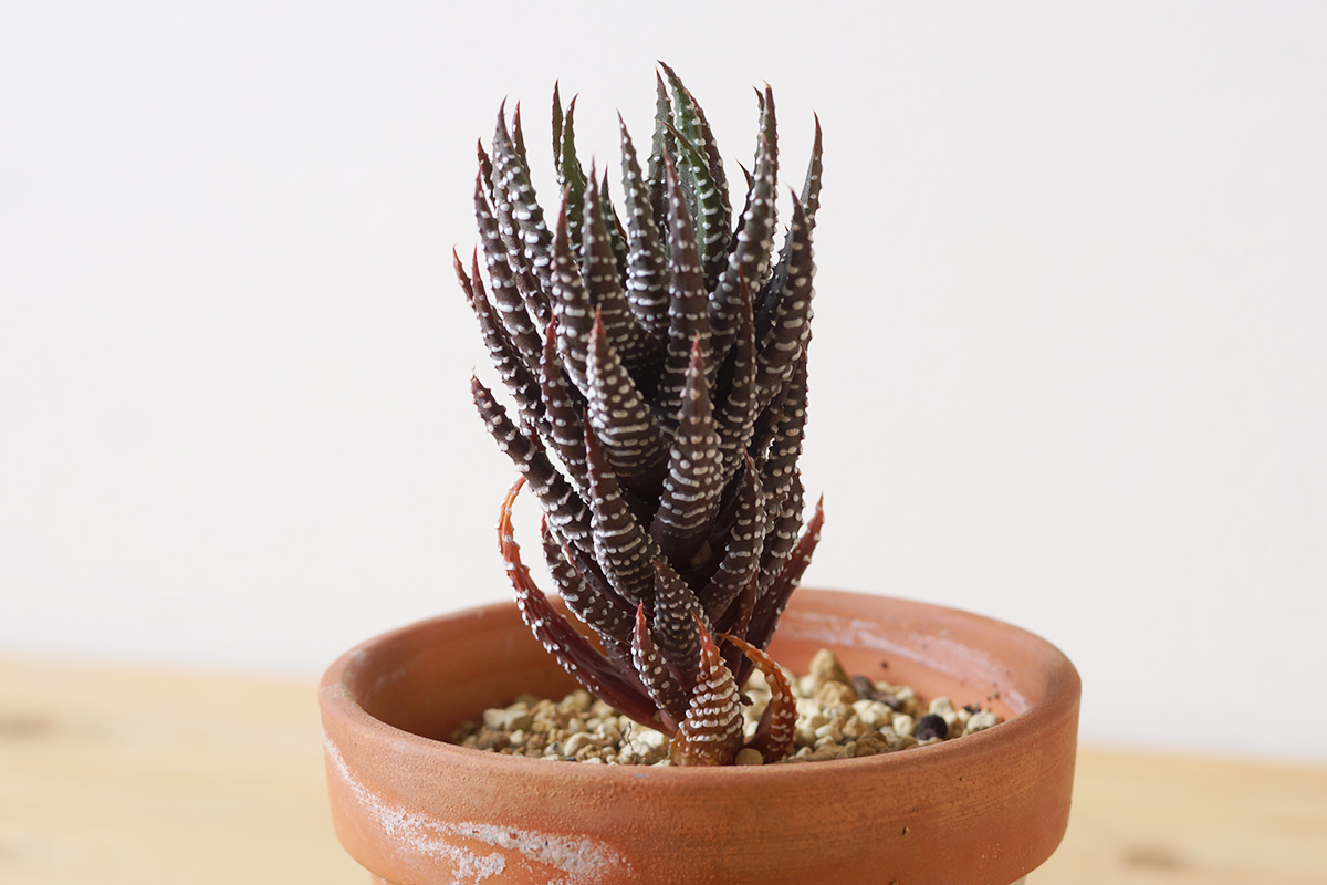またハオルシア属の硬葉系は少しでも日当たりが強いと感じるとこのように赤黒い葉色になりますが、しばらく日蔭気味の場所に置くことで色合いがかなり緑に戻ります。