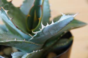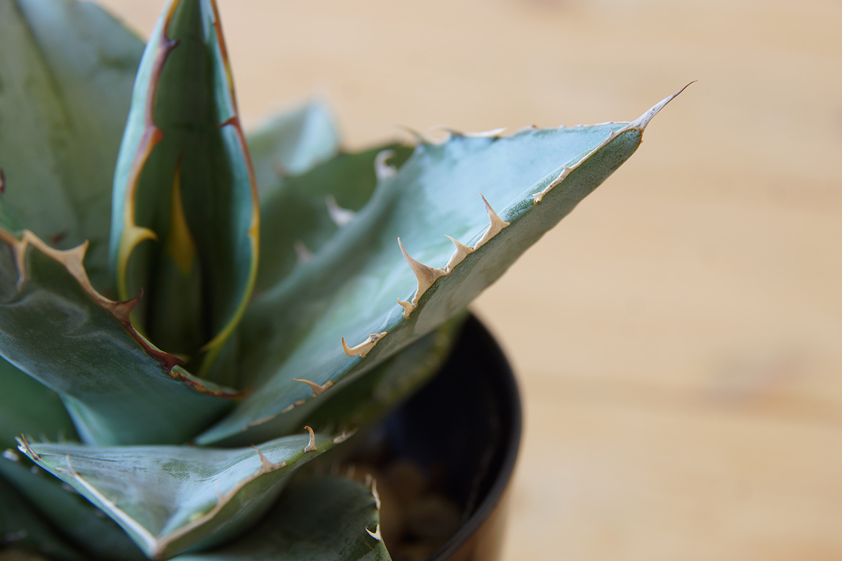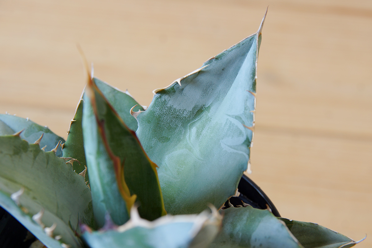 こちらがUCHIのアガベ・チタノタ ブルーの現在の、鋸歯の様子のひとつで、これまで比較的小さく短くといった感じですが、ようやくより危険な香りのするノコギリ感が出てきたのでないかと思います。